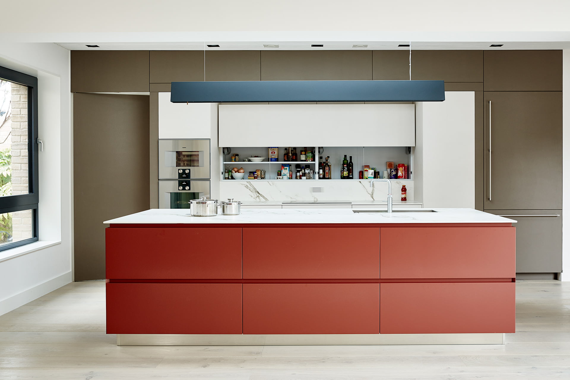 Contemporary Kitchen Design by Peter Bernard and the client to produce a truly unique result. The tall doors are cement finish, a durable and understated finish to a large kitchen space incorporating the utility door and large fridge at each end.